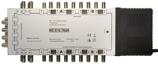 Kaskadierbarer DiSEqC-Multischalter mit 8 Stammein/- ausgängen für SAT, einem Stammein/-ausgang für Terrestrik und 16 Teilnehmerausgängen.