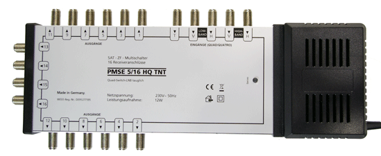 Multischalter mit 4 Sat-Eingängen und einem terrestrischen Eingang. Dabei ermöglichen 16 Ausgänge den Anschluss von bis zu 16 Teilnehmern.